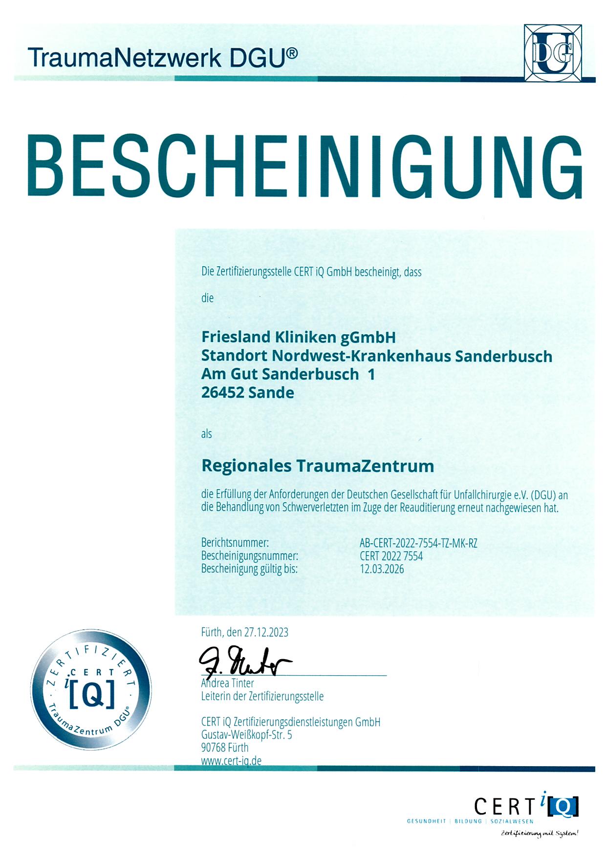 Die zertifizierte Klinik ist im Rahmen der Traumanetzwerkbildung der Deutschen Gesellschaft für Unfallchirurgie in das Traumanetzwerk Oldenburg/Ostfriesland eingebunden und stellt hier als regionales Traumazentrum eine Schwerpunktklinik dar.
